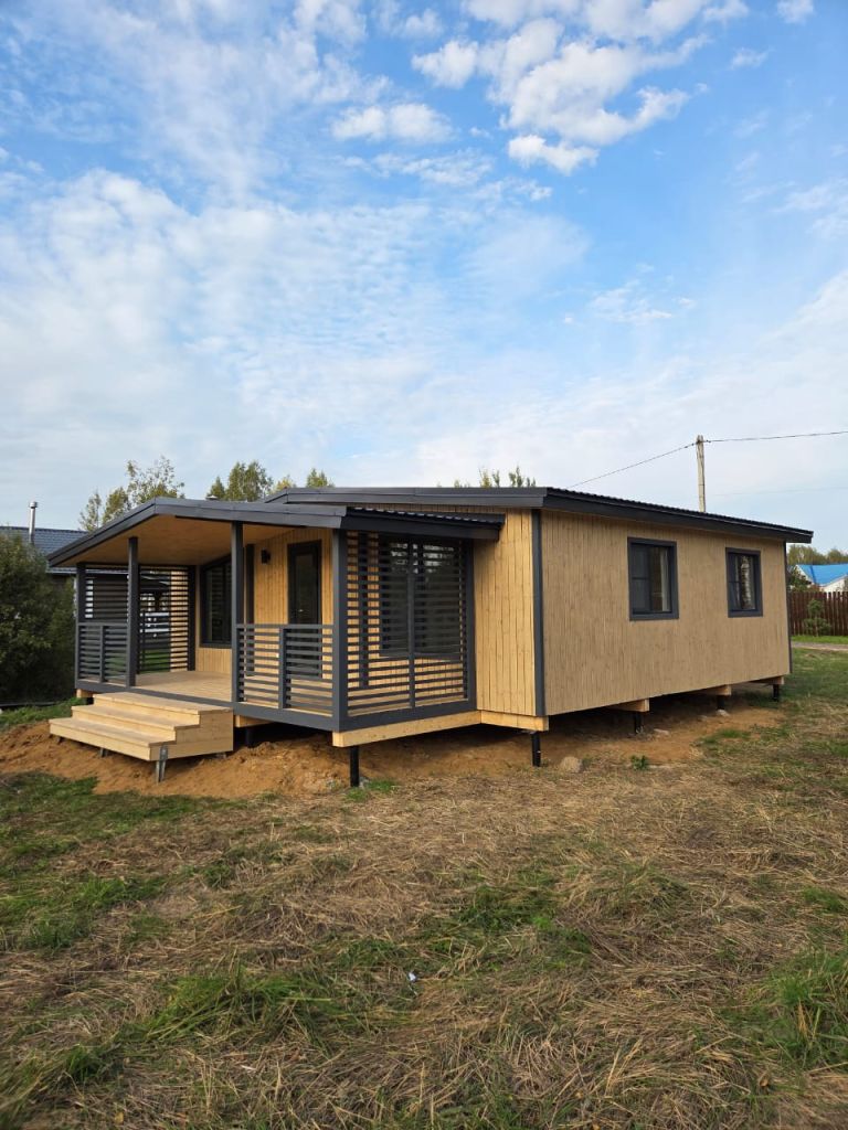 Каркасный дом «Домов Шале" 78 м² с террасой» на вашем участкеИдеально подойдёт для дачи или круглогодичного проживания.Современное архитектурное решение: панорамное остекление, чистовая отделка, качественные материалы — дом тёплый, просторный и уютный.Планировка: — Просторная кухня-гостиная— 2 спальни— Санузел— Прихожая— ТеррасаХарактеристики: — Площадь дома: 78 м²— Отделка: покраска снаружи и внутри— Фундамент: винтовые сваи с обвязкой— Окна: двухкамерные стеклопакеты— Утепление: 150 мм— Перегородки и двери установленыДополнительно можем выполнить: — Ламинацию окон— Монтаж коммуникаций и электрики— Установку сантехники— Установку печи-камина— Обшивку цоколя сайдингом— Устройство тёплого пола— Напольное покрытие кварц-винил— И другие улучшения по вашему желанию Дом представлен как образец проекта.