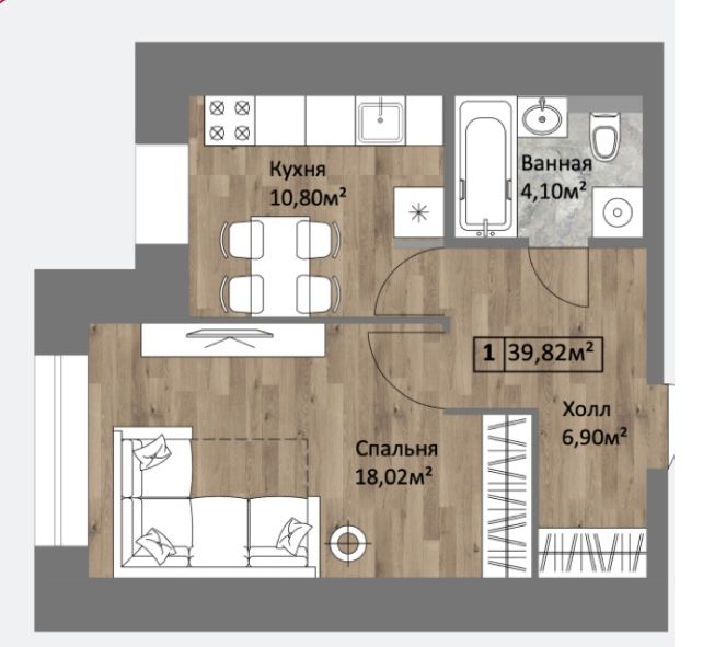Площадь (кв.м.) | Общая: 39.8 Жилая: 18 Кухня: 10.8 39.8 / 18 / 10.8 |